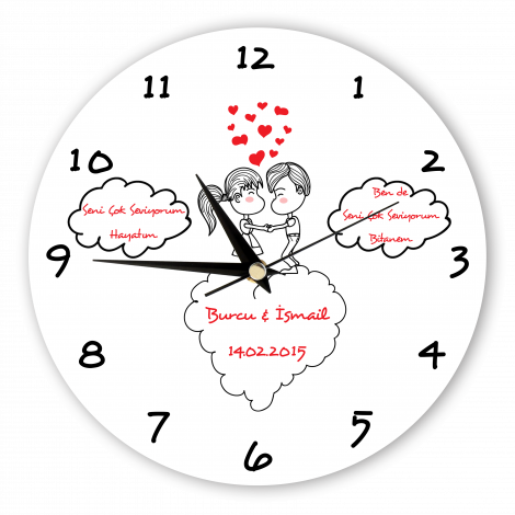 Aşıklara Özel Kalp Bulutu İsim ve Mesaj Yazılı Duvar Saati