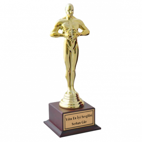 Kişiye özel oscar başarı ödülü altın sarısı renkte olup, ahşap zemin üzerine oturtulmuştur.